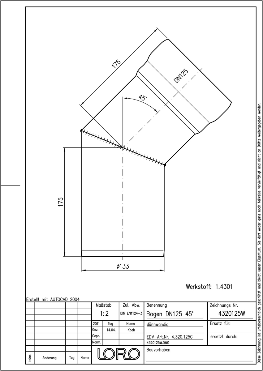LORO-XCL Bogen, aus Edelstahl, Werkstoff Nr. 1.4301, gebeizt und passiviert, nach DIN EN 1124 mit erhöhtem Qualitätsstandard gemäß RAL-Gütezeichen GZ-694, mit 2-Kammern-Steckmuffenverbindung, Baustoffklasse A1, formstabil, bruchfest, rückstausicher, 45 Grad, DN 125