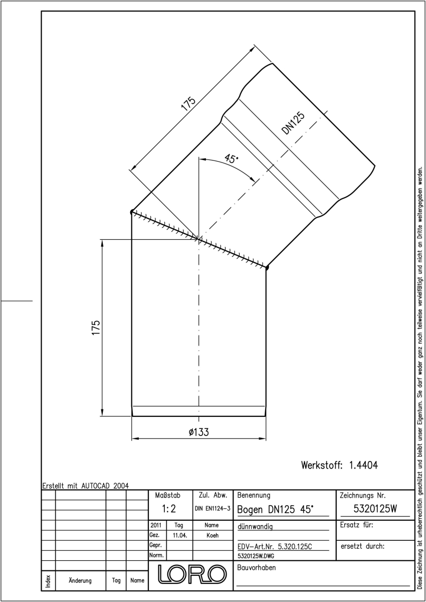 LORO-XCL Bogen, aus Edelstahl, Werkstoff Nr. 1.4404, gebeizt und passiviert, nach DIN EN 1124 mit erhöhtem Qualitätsstandard gemäß RAL-Gütezeichen GZ-694, mit 2-Kammern-Steckmuffenverbindung, Baustoffklasse A1, formstabil, bruchfest, rückstausicher, 45 Grad, DN 125