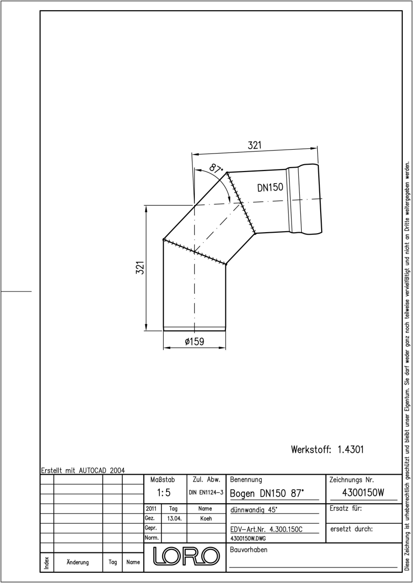 LORO-XCL Bogen, aus Edelstahl, Werkstoff Nr. 1.4301, gebeizt und passiviert, nach DIN EN 1124 mit erhöhtem Qualitätsstandard gemäß RAL-Gütezeichen GZ-694, mit 2-Kammern-Steckmuffenverbindung, Baustoffklasse A1, formstabil, bruchfest, rückstausicher, 87 Grad, DN 150
