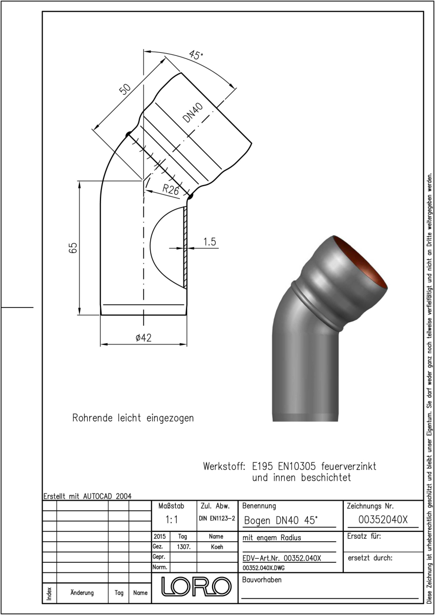 LORO-X Bogen mit engem Radius, aus Stahl, feuerverzinkt, nach DIN EN 1123 mit erhöhtem Qualitätsstandard gemäß RAL-Gütezeichen GZ-694, mit 2-Kammern-Steckmuffenverbindung, Baustoffklasse A1, formstabil, bruchfest, rückstausicher, langlebige Innenbeschichtung gemäß DIN EN ISO 2178 auf Basis einer 2K-Epoxid-Kombination, Farbton: Rotbraun, 45 Grad, DN 40