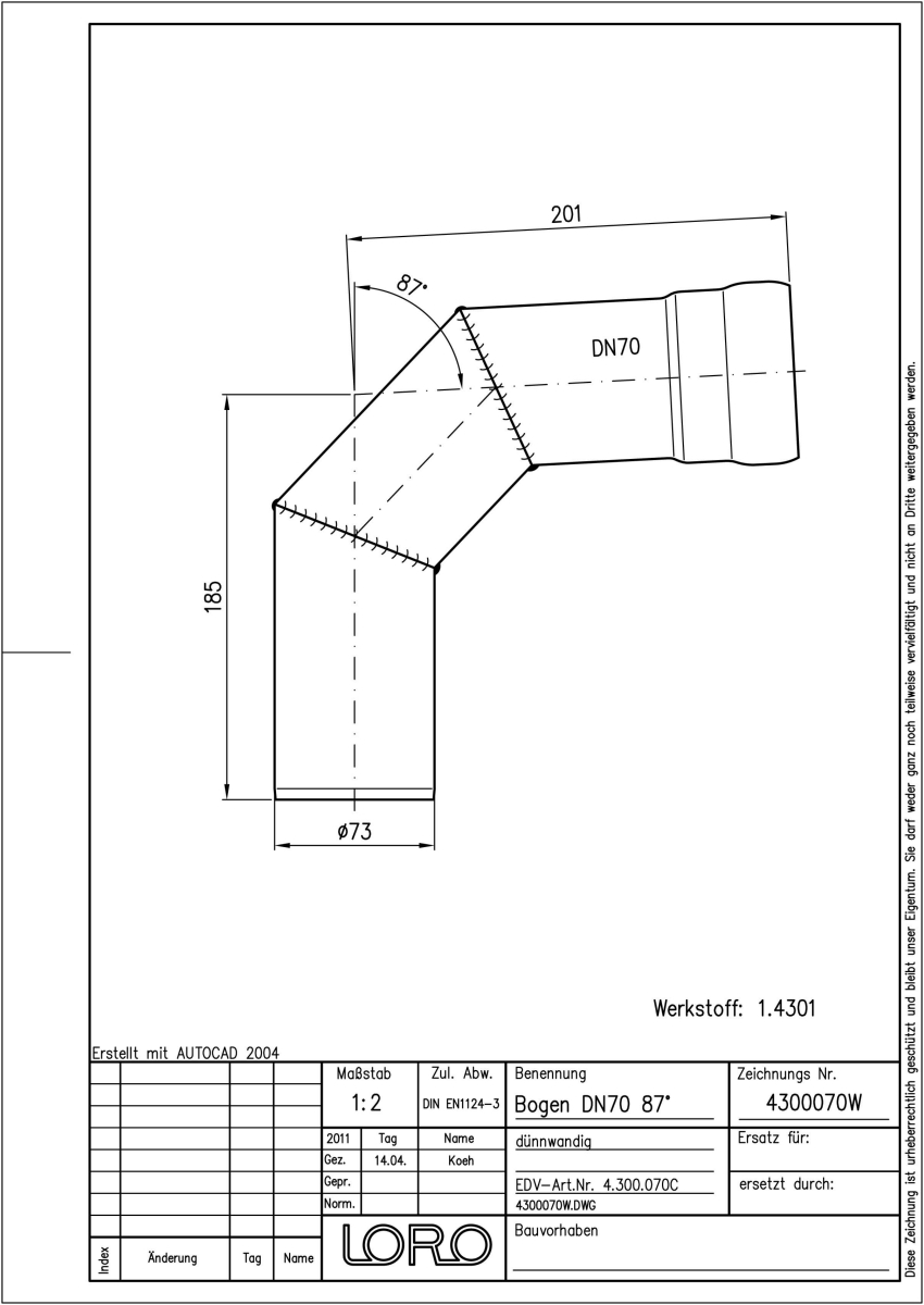 LORO-XCL Bogen, aus Edelstahl, Werkstoff Nr. 1.4301, gebeizt und passiviert, nach DIN EN 1124 mit erhöhtem Qualitätsstandard gemäß RAL-Gütezeichen GZ-694, mit 2-Kammern-Steckmuffenverbindung, Baustoffklasse A1, formstabil, bruchfest, rückstausicher, 87 Grad, DN 70