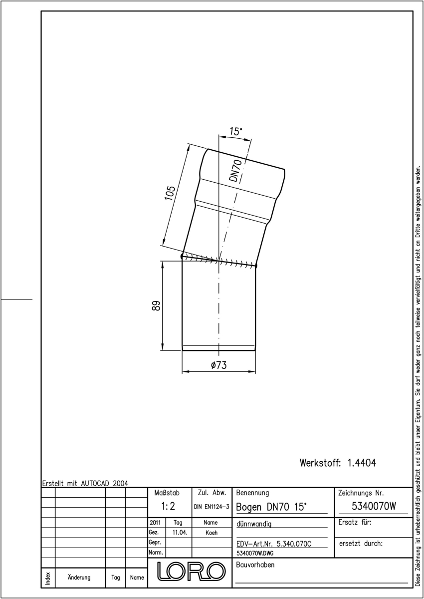 LORO-XCL Bogen, aus Edelstahl, Werkstoff Nr. 1.4404, gebeizt und passiviert, nach DIN EN 1124 mit erhöhtem Qualitätsstandard gemäß RAL-Gütezeichen GZ-694, mit 2-Kammern-Steckmuffenverbindung, Baustoffklasse A1, formstabil, bruchfest, rückstausicher, 15 Grad, DN 70