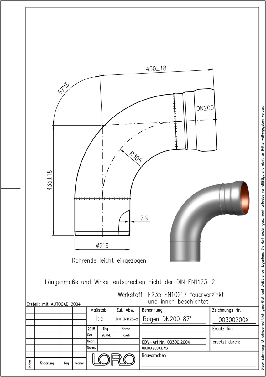 LORO-X Bogen, aus Stahl, feuerverzinkt, nach DIN EN 1123 mit erhöhtem Qualitätsstandard gemäß RAL-Gütezeichen GZ-694, mit 2-Kammern-Steckmuffenverbindung, Baustoffklasse A1, formstabil, bruchfest, rückstausicher, langlebige Innenbeschichtung gemäß DIN EN ISO 2178 auf Basis einer 2K-Epoxid-Kombination, Farbton: Rotbraun, 87 Grad, DN 200