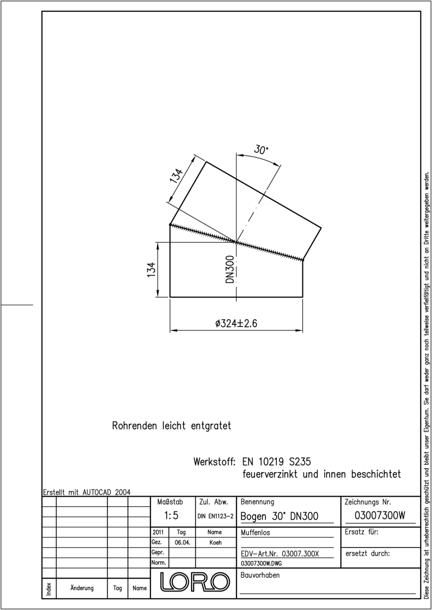 LORO-XML Bogen, aus Stahl, feuerverzinkt, muffenlos, nach DIN EN 1123 mit erhöhtem Qualitätsstandard gemäß RAL-Gütezeichen GZ-694, Baustoffklasse A1, formstabil, bruchfest, rückstausicher, langlebige Innenbeschichtung gemäß DIN EN ISO 2178 auf Basis einer 2K-Epoxid-Kombination, Farbton: Rotbraun, Zulassung Nr. Z-42.1-346 vom DIBt, 30 Grad, DN 300