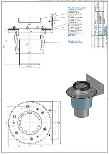 LORO-DRAINLET Rohrdurchführung für Freispiegelströmung, mit Aufkantung, nach DIN EN 1253 mit erhöhtem Qualitätsstandard gemäß RAL-Gütezeichen GZ-694, mit Klemmflansch, als Los- und Festflanschkonstruktion, für Kunststoff-Abdichtungsbahnen, aus Edelstahl, mit Wärmedämmung, DN 150