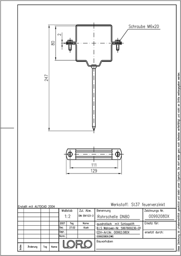 LORO-X Rohrschelle, aus Stahl, verzinkt, quadratisch, mit Schlagstift, 150 mm lang, DN 80