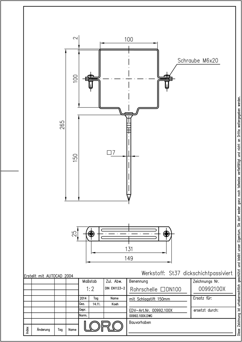 LORO-X Rohrschelle, aus Stahl, verzinkt, quadratisch, mit Schlagstift, 150 mm lang, DN 100
