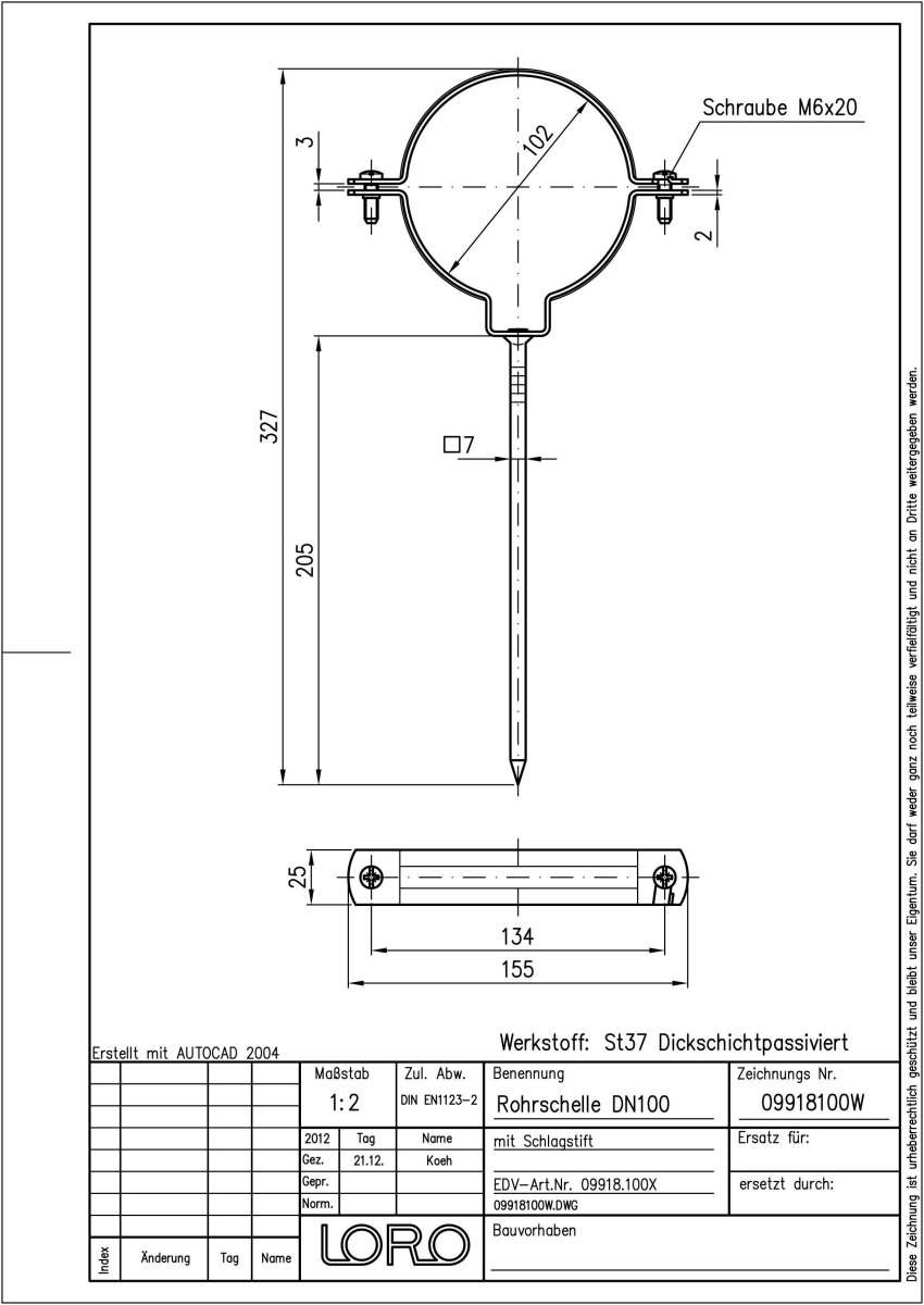 LORO-X Rohrschelle mit verlängertem Schlagstift, 200 mm lang aus Stahl, feuerverzinkt, ohne Schalldämmung DN 100
