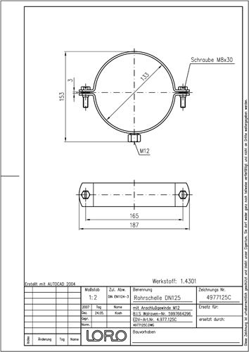 LORO-XCL Rohrschellen mit Anschlussgewinde M 12, rund, aus Edelstahl 1.4301, ohne Schalldämmung, DN 125