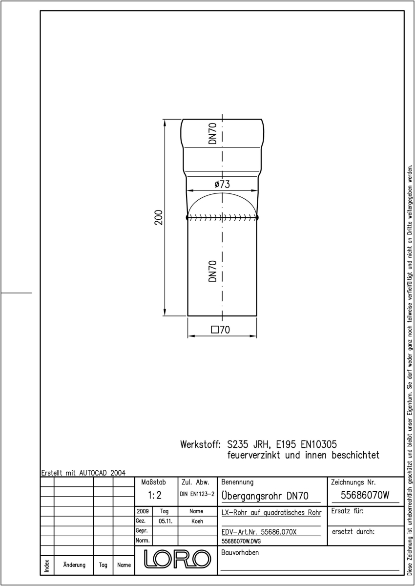 LORO-X Übergangsrohr, aus Stahl, feuerverzinkt, rund auf quadratisch, nach DIN EN 1123, mit erhöhtem Qualitätsstandard gemäß RAL-Gütezeichen GZ-694, Baustoffklasse A1, formstabil, bruchfest, langlebige Innenbeschichtung gemäß DIN EN ISO 2178 auf Basis einer 2K-Epoxid-Kombination, Farbton: Rotbraun, DN 70