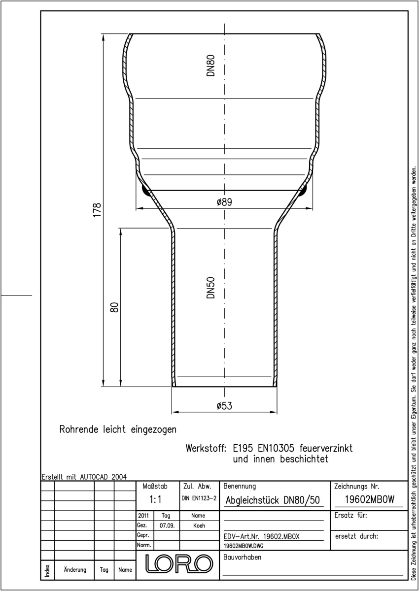 LORO-DRAINJET Abgleichstück für Druckströmung, aus Stahl, feuerverzinkt , langlebige Innenbeschichtung gemäß DIN EN ISO 2178 auf Basis einer 2K-Epoxid-Kombination, Farbton: Rotbraun, DN 80/50