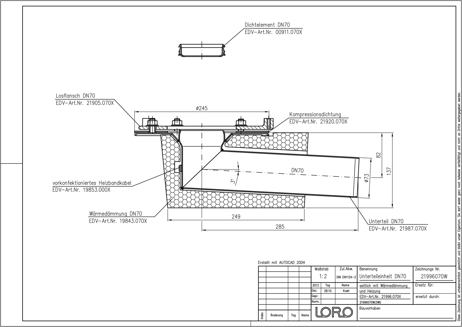 LORO-DRAINLET Flachdach-Schnellablauf Unterteileinheit, für Druckströmung mit planmäßiger Vollfüllung, nach DIN EN 1253 mit erhöhtem Qualitätsstandard gemäß RAL-Gütezeichen, mit Klemmflansch, als Los- und Festflanschkonstruktion, aus Edelstahl, Auslauf seitlich, mit Wärmedämmung und Heizung, einteilig, bestehend aus Unterteil, Losflansch, einschließlich Kompressionsdichtungen, Dichtelement, DN 70