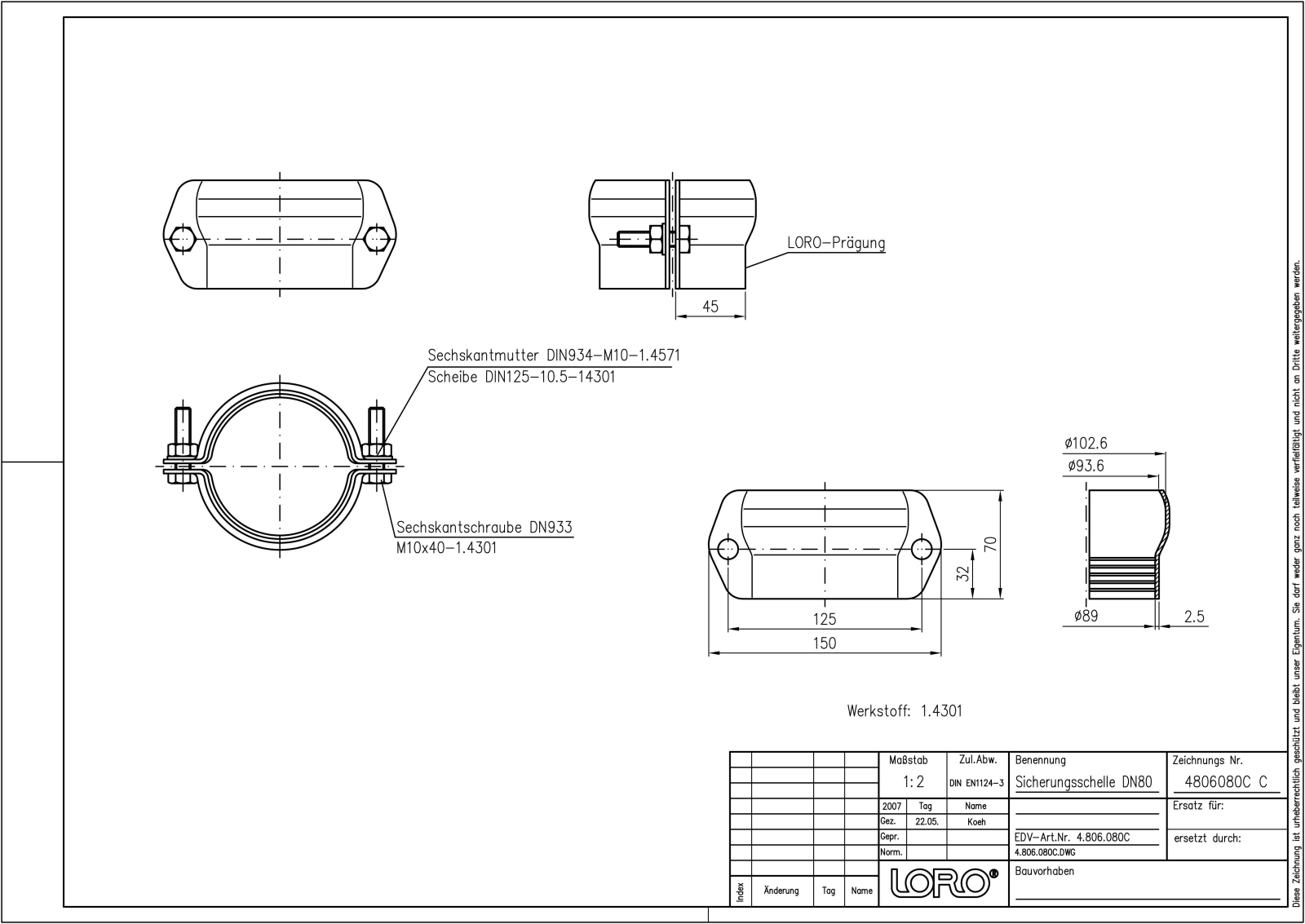 LORO-XCL Sicherungsschelle, aus Edelstahl, Werkstoff Nr. 1.4301, nach DIN EN 1124, mit erhöhtem Qualitätsstandard gemäß RAL-Gütezeichen GZ-694, Baustoffklasse A1, formstabil, bruchfest, zur axialen Schubsicherung für druckbeaufschlagte Leitungen, DN 80