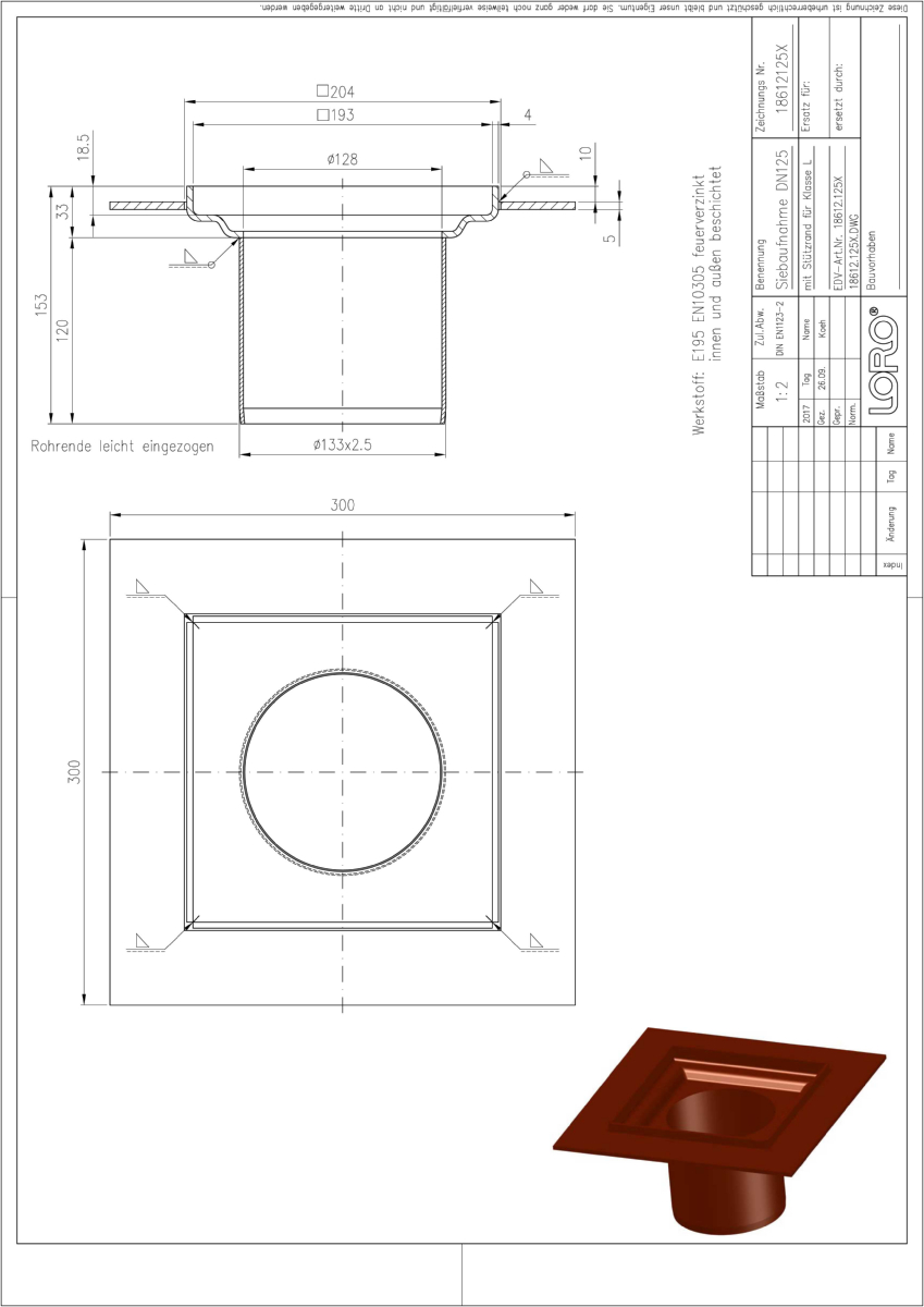 LORO-Siebaufnahme, aus Stahl, mit Stützrand, feuerverzinkt, langlebige Innenbeschichtung gemäß DIN EN ISO 2178 auf Basis einer 2K-Epoxid-Kombination, Farbton: Rotbraun, 199 x 199 mm, für Aufbauhöhe 40 - 75 mm, DN 125