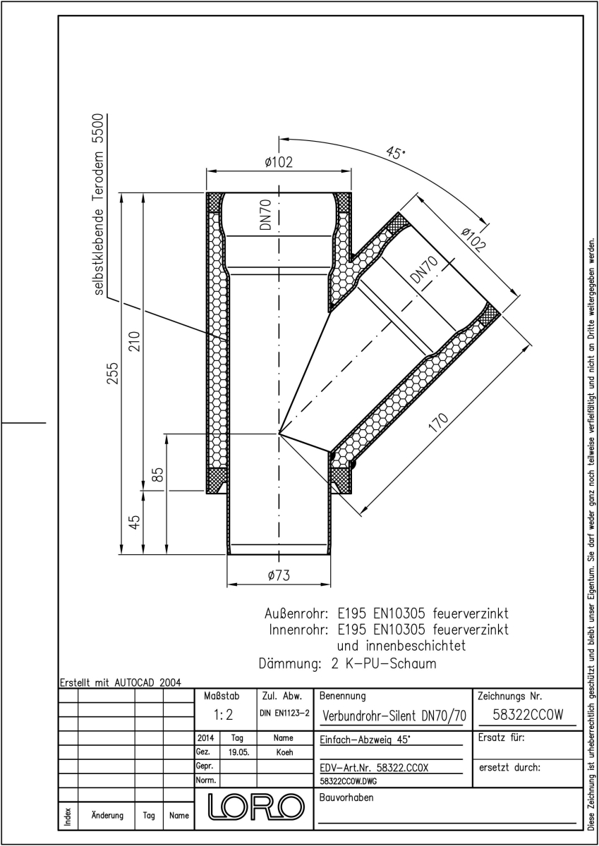 LORO-X Verbundrohr-Abzweig, Ausführung SILENT, für erhöhte Schalldämmung, bestehend aus: Innenrohr (LORO-X Rohr, aus Stahl, feuerverzinkt, nach DIN EN 1123, mit erhöhtem Qualitätsstandard gemäß RAL-Gütezeichen GZ-694, mit 2-Kammern-Steckmuffenverbindung, Baustoffklasse A1, formstabil, bruchfest, rückstausicher, langlebige Innenbeschichtung gemäß DIN EN ISO 2178 auf Basis einer 2K-Epoxid-Kombination, Farbton: Rotbraun), Schallschutzmatte (am Innenrohr angebracht), Dämmschicht (PU-Hartschaum B2, FCKW-frei) und Außenrohr (LORO-X Rohr, feuerverzinkt) 45 Grad, DN 70