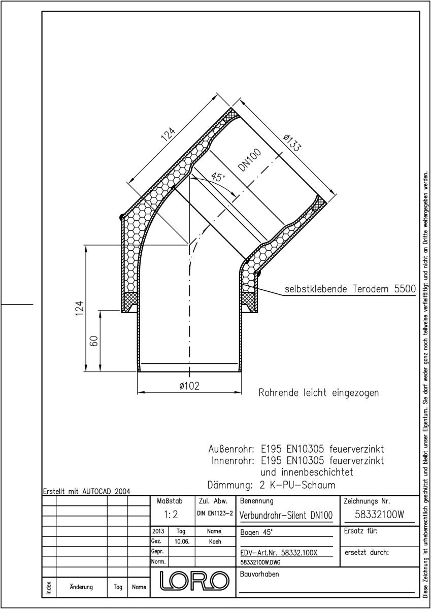 LORO-X Verbundrohr-Bogen, Ausführung SILENT, für erhöhte Schalldämmung, bestehend aus: Innenrohr (LORO-X Rohr, aus Stahl, feuerverzinkt, nach DIN EN 1123, mit erhöhtem Qualitätsstandard gemäß RAL-Gütezeichen GZ-694, mit 2-Kammern-Steckmuffenverbindung, Baustoffklasse A1, formstabil, bruchfest, rückstausicher, langlebige Innenbeschichtung gemäß DIN EN ISO 2178 auf Basis einer 2K-Epoxid-Kombination, Farbton: Rotbraun), Schallschutzmatte (am Innenrohr angebracht), Dämmschicht (PU-Hartschaum B2, FCKW-frei) und Außenrohr (LORO-X Rohr, feuerverzinkt) 45 Grad, DN 100
