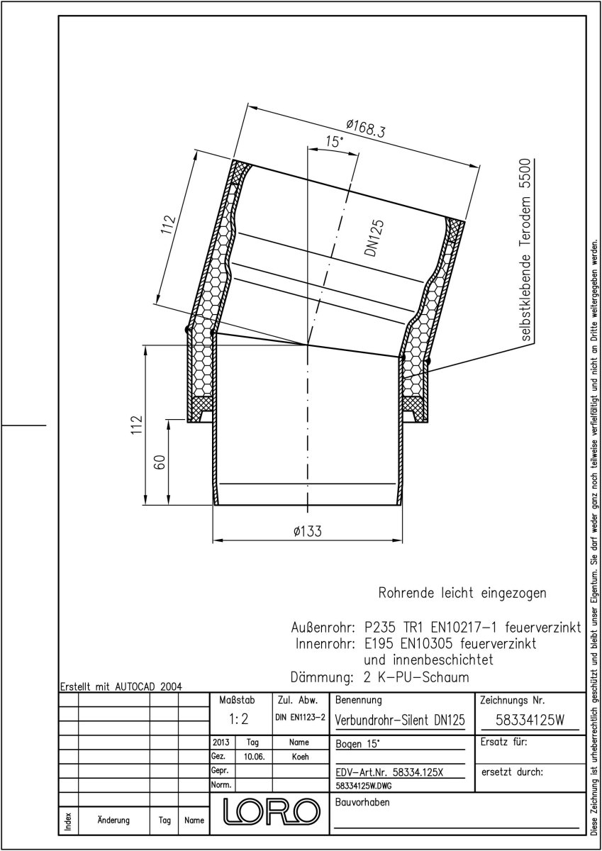 LORO-X Verbundrohr-Bogen, Ausführung SILENT, für erhöhte Schalldämmung, bestehend aus: Innenrohr (LORO-X Rohr, aus Stahl, feuerverzinkt, nach DIN EN 1123, mit erhöhtem Qualitätsstandard gemäß RAL-Gütezeichen GZ-694, mit 2-Kammern-Steckmuffenverbindung, Baustoffklasse A1, formstabil, bruchfest, rückstausicher, langlebige Innenbeschichtung gemäß DIN EN ISO 2178 auf Basis einer 2K-Epoxid-Kombination, Farbton: Rotbraun), Schallschutzmatte (am Innenrohr angebracht), Dämmschicht (PU-Hartschaum B2, FCKW-frei) und Außenrohr (LORO-X Rohr, feuerverzinkt) 15 Grad, DN 125