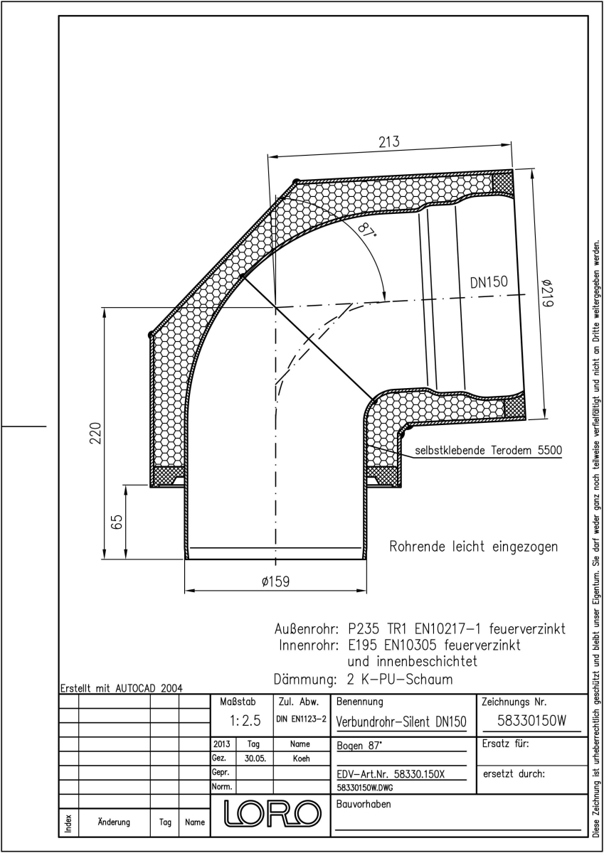 LORO-X Verbundrohr-Bogen, Ausführung SILENT, für erhöhte Schalldämmung, bestehend aus: Innenrohr (LORO-X Rohr, aus Stahl, feuerverzinkt, nach DIN EN 1123, mit erhöhtem Qualitätsstandard gemäß RAL-Gütezeichen GZ-694, mit 2-Kammern-Steckmuffenverbindung, Baustoffklasse A1, formstabil, bruchfest, rückstausicher, langlebige Innenbeschichtung gemäß DIN EN ISO 2178 auf Basis einer 2K-Epoxid-Kombination, Farbton: Rotbraun), Schallschutzmatte (am Innenrohr angebracht), Dämmschicht (PU-Hartschaum B2, FCKW-frei) und Außenrohr (LORO-X Rohr, feuerverzinkt) 87 Grad, DN 150