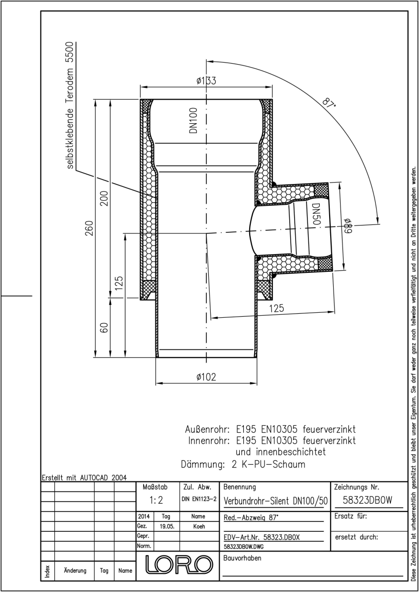 LORO-X Verbundrohr-Red.-Abzweig, Ausführung SILENT, für erhöhte Schalldämmung, bestehend aus: Innenrohr (LORO-X Rohr, aus Stahl, feuerverzinkt, nach DIN EN 1123, mit erhöhtem Qualitätsstandard gemäß RAL-Gütezeichen GZ-694, mit 2-Kammern-Steckmuffenverbindung, Baustoffklasse A1, formstabil, bruchfest, rückstausicher, langlebige Innenbeschichtung gemäß DIN EN ISO 2178 auf Basis einer 2K-Epoxid-Kombination, Farbton: Rotbraun), Dämmschicht (PU-Hartschaum B2, FCKW-frei) und Außenrohr (LORO-X Rohr, feuerverzinkt) 87 Grad, DN 100/50