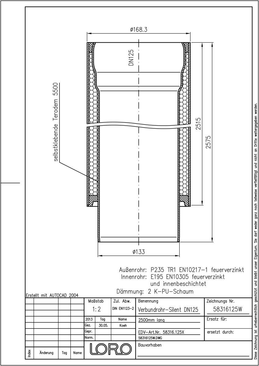 LORO-X Verbundrohr, Ausführung SILENT, für erhöhte Schalldämmung, bestehend aus: Innenrohr (LORO-X Rohr, aus Stahl, feuerverzinkt, nach DIN EN 1123, mit erhöhtem Qualitätsstandard gemäß RAL-Gütezeichen GZ-694, mit 2-Kammern-Steckmuffenverbindung, Baustoffklasse A1, formstabil, bruchfest, rückstausicher, langlebige Innenbeschichtung gemäß DIN EN ISO 2178 auf Basis einer 2K-Epoxid-Kombination, Farbton: Rotbraun), Schallschutzmatte (am Innenrohr angebracht), Dämmschicht (PU-Hartschaum B2, FCKW-frei) und Außenrohr (LORO-X Rohr, feuerverzinkt) 2500 mm lang, DN 125