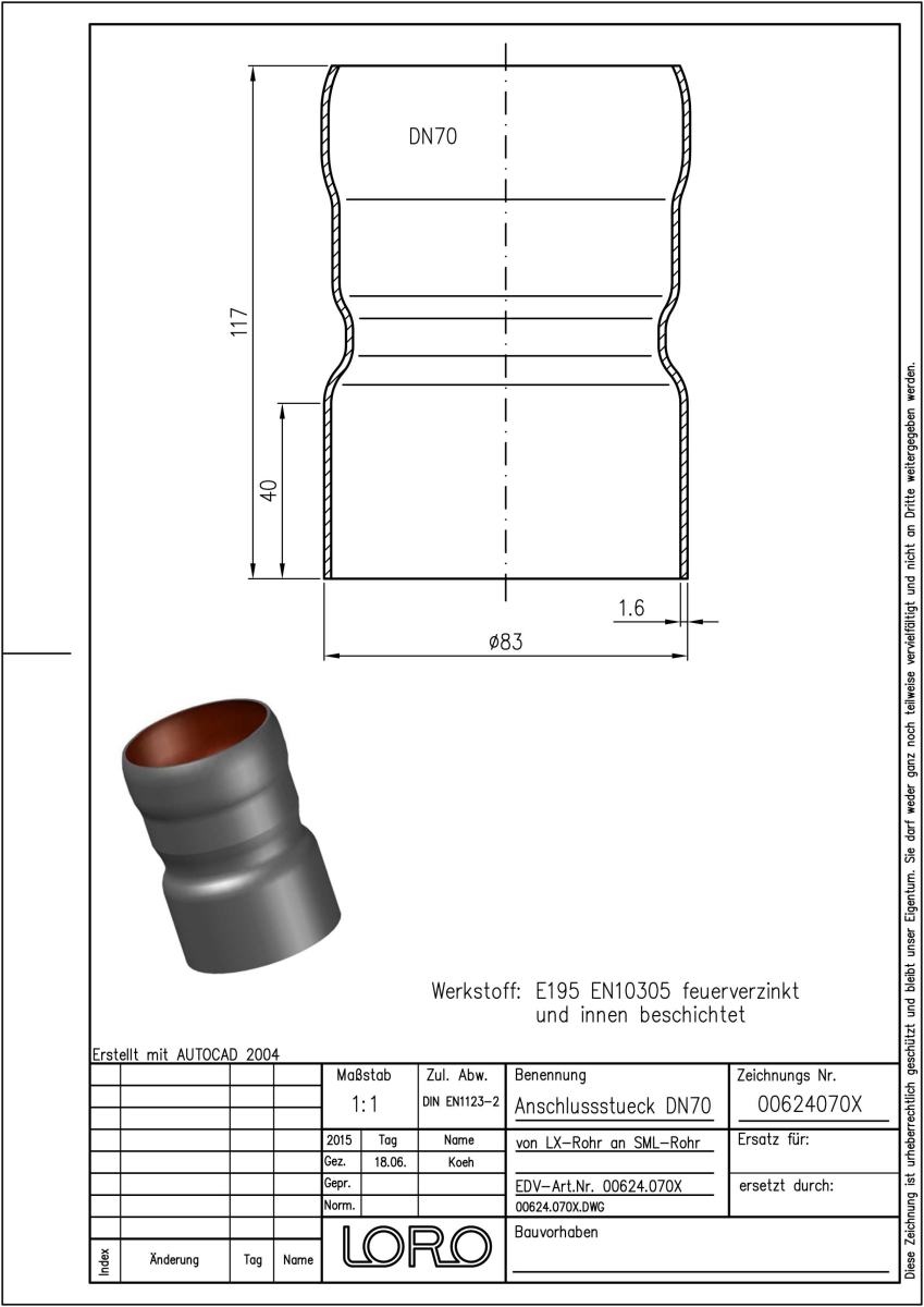 LORO-X Anschlussstück aus Stahl, feuerverzinkt, von LORO-X Rohr DN 70 an SML-Rohr DN 80 nach DIN EN 1123 mit erhöhtem Qualitätsstandard gemäß RAL-Gütezeichen GZ-694, mit 2-Kammern-Steckmuffenverbindung, Baustoffklasse A1, formstabil, bruchfest, rückstausicher, langlebige Innenbeschichtung gemäß DIN EN ISO 2178 auf Basis einer 2K-Epoxid-Kombination, Farbton: Rotbraun, DN 70/80