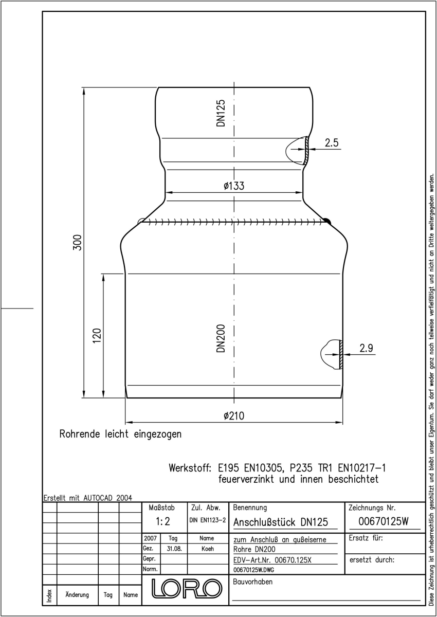 LORO-X Anschlussstück aus Stahl, feuerverzinkt, von LORO-X Rohr DN 125 an SML-Rohr und Steinzeugrohrmuffe DN 200 nach DIN EN 1123 mit erhöhtem Qualitätsstandard gemäß RAL-Gütezeichen GZ-694, mit 2-Kammern-Steckmuffenverbindung, Baustoffklasse A1, formstabil, bruchfest, rückstausicher, langlebige Innenbeschichtung gemäß DIN EN ISO 2178 auf Basis einer 2K-Epoxid-Kombination, Farbton: Rotbraun, DN 125/200