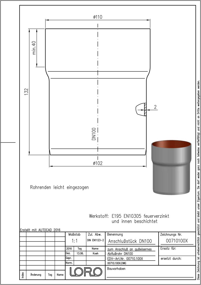 LORO-X Anschlussstück aus Stahl, feuerverzinkt, zum Übergang von SML-Rohr DN100 an Stahlrohrmuffe DN 100, nach DIN EN 1123 mit erhöhtem Qualitätsstandard gemäß RAL-Gütezeichen GZ-694, mit 2-Kammern-Steckmuffenverbindung, Baustoffklasse A1, formstabil, bruchfest, rückstausicher, langlebige Innenbeschichtung gemäß DIN EN ISO 2178 auf Basis einer 2K-Epoxid-Kombination, Farbton: Rotbraun, DN 100/100