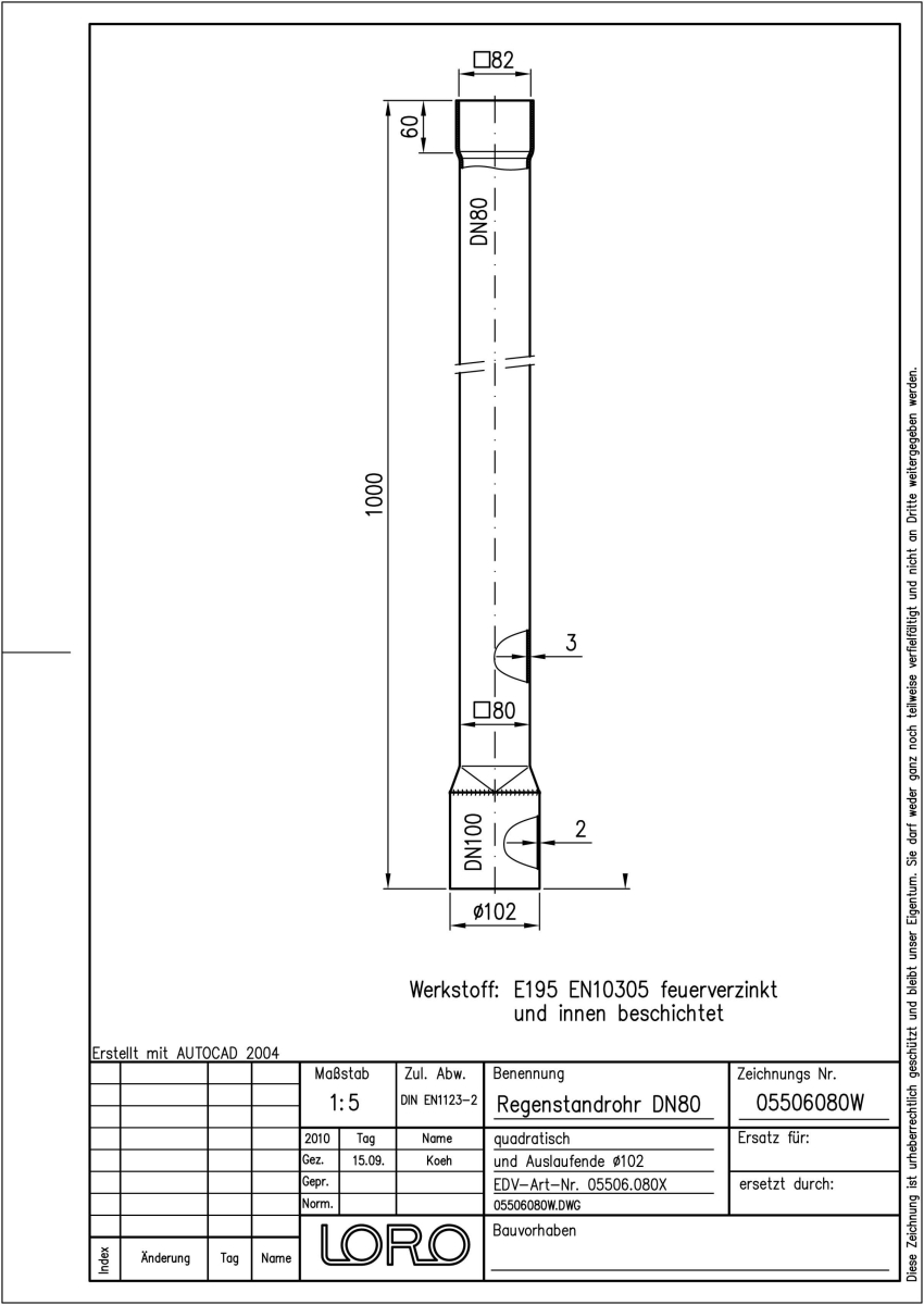 LORO-X Regenstandrohr, aus Stahl, feuerverzinkt, quadratisch, ohne Reinigungsöffnung, Rohrende rund DN 100, nach DIN EN 1123 mit erhöhtem Qualitätsstandard gemäß RAL-Gütezeichen GZ-694, Baustoffklasse A1, formstabil, bruchfest, langlebige Innenbeschichtung gemäß DIN EN ISO 2178 auf Basis einer 2K-Epoxid-Kombination, Farbton: Rotbraun, 1000 mm, DN 80