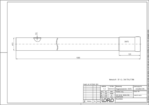 LORO-N Regenstandrohr, aus Kupfer, nach DIN 1754/1786, rund, ohne Reinigungsöffnung, mit erhöhtem Qualitätsstandard gemäß RAL-Gütezeichen GZ-694, mit 2-Kammern-Steckmuffenverbindung, Baustoffklasse A1, formstabil, bruchfest, rückstausicher, 1000 mm, DN 70