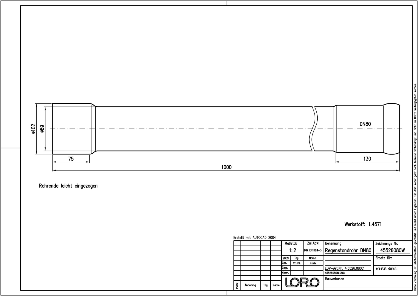 LORO-XCL Regenstandrohr, aus Edelstahl, Werkstoff 1.4571, gebeizt und passiviert, rund, ohne Reinigungsöffnung, nach DIN EN 1124 mit erhöhtem Qualitätsstandard gemäß RAL-Gütezeichen GZ-694, mit 2-Kammern-Steckmuffenverbindung, Baustoffklasse A1, formstabil, bruchfest, rückstausicher, 1000 mm, DN 80