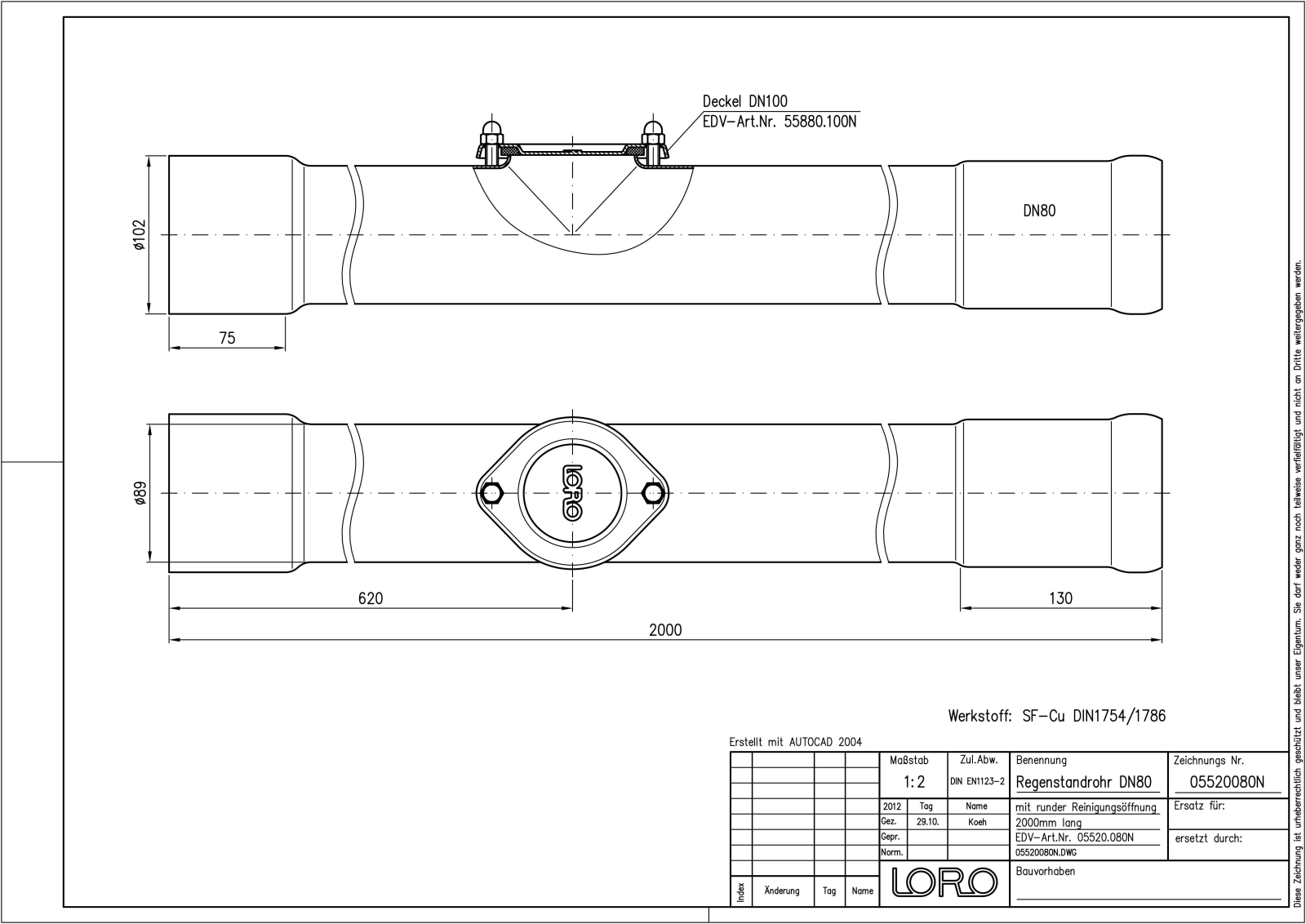LORO-N Regenstandrohr, aus Kupfer, nach DIN 1754/1786, rund, mit Reinigungsöffnung, mit erhöhtem Qualitätsstandard gemäß RAL-Gütezeichen GZ-694, mit 2-Kammern-Steckmuffenverbindung, Baustoffklasse A1, formstabil, bruchfest, rückstausicher, 2000 mm, DN 80