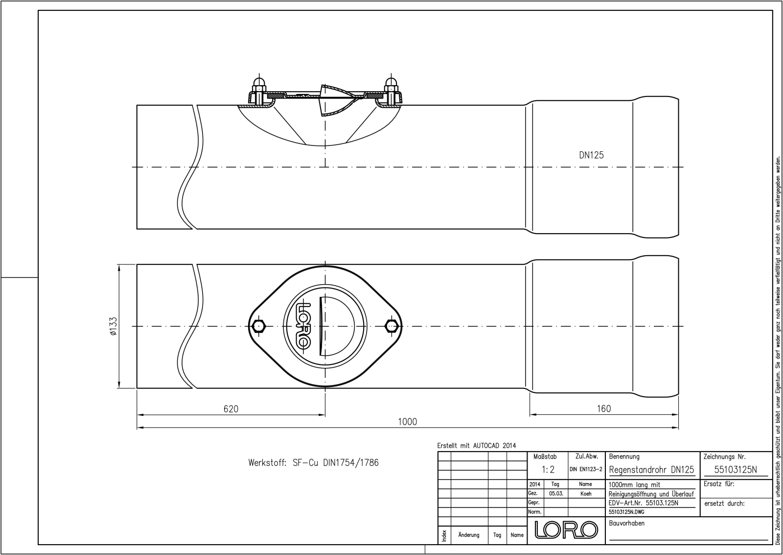 LORO-N Regenstandrohr, aus Kupfer nach DIN 1754/1786, rund, mit Reinigungsöffnung und Reinigungsdeckel mit Sicherheitsüberlauf, mit erhöhtem Qualitätsstandard gemäß RAL-Gütezeichen GZ-694, mit 2-Kammern-Steckmuffenverbindung, Baustoffklasse A1, formstabil, bruchfest, rückstausicher, 1000 mm, DN 125