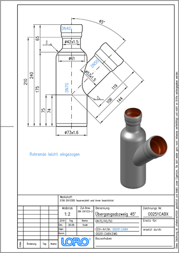 LORO-X Übergangsabzweig, aus Stahl, feuerverzinkt, nach DIN EN 1123, mit erhöhtem Qualitätsstandard gemäß RAL-Gütezeichen GZ-694, mit 2-Kammern-Steckmuffenverbindung, Baustoffklasse A1, formstabil, bruchfest, rückstausicher, langlebige Innenbeschichtung gemäß DIN EN ISO 2178 auf Basis einer 2K-Epoxid-Kombination, Farbton: Rotbraun, 45 Grad, DN 70/40/50