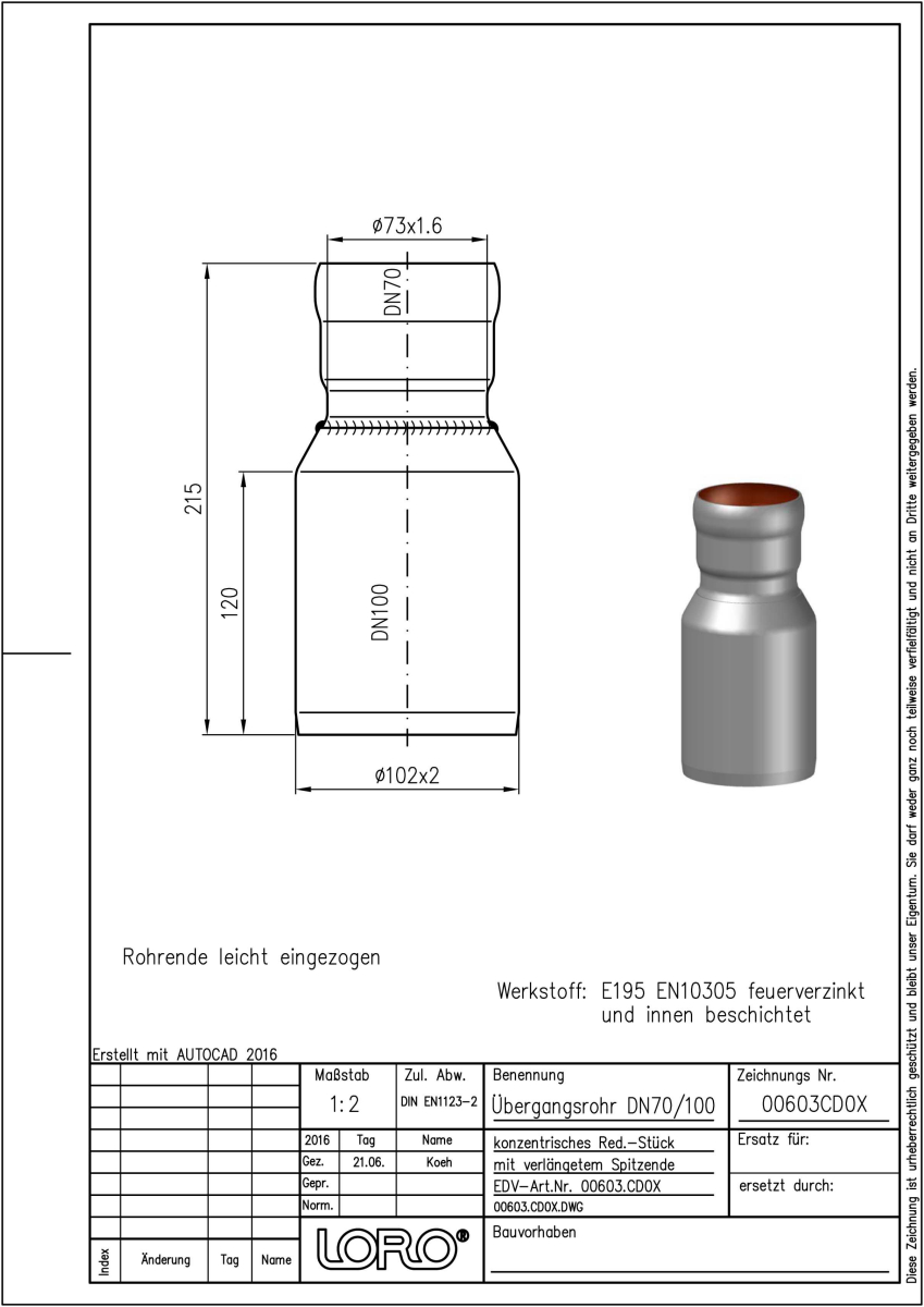 LORO-X Übergangsrohr, aus Stahl, feuerverzinkt, konzentrisch, mit verlängertem Spitzende, passend für Sicherungsschelle Art.-Nr. 806X, nach DIN EN 1123 mit erhöhtem Qualitätsstandard gemäß RAL-Gütezeichen GZ-694, mit 2-Kammern-Steckmuffenverbindung, Baustoffklasse A1, formstabil, bruchfest, rückstausicher, langlebige Innenbeschichtung gemäß DIN EN ISO 2178 auf Basis einer 2K-Epoxid-Kombination, Farbton: Rotbraun, DN 70/100