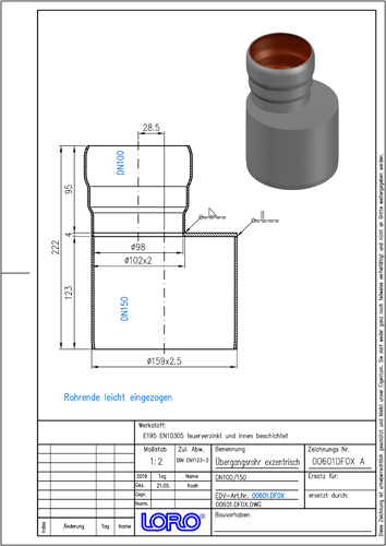 LORO-X Übergangsrohr, aus Stahl, feuerverzinkt, exzentrisch, nach DIN EN 1123 mit erhöhtem Qualitätsstandard gemäß RAL-Gütezeichen GZ-694, mit 2-Kammern-Steckmuffenverbindung, Baustoffklasse A1, formstabil, bruchfest, rückstausicher, langlebige Innenbeschichtung gemäß DIN EN ISO 2178 auf Basis einer 2K-Epoxid-Kombination, Farbton: Rotbraun, DN 100/150