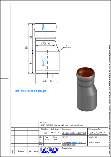 LORO-X Übergangsrohr, aus Stahl, feuerverzinkt, exzentrisch, nach DIN EN 1123 mit erhöhtem Qualitätsstandard gemäß RAL-Gütezeichen GZ-694, mit 2-Kammern-Steckmuffenverbindung, Baustoffklasse A1, formstabil, bruchfest, rückstausicher, langlebige Innenbeschichtung gemäß DIN EN ISO 2178 auf Basis einer 2K-Epoxid-Kombination, Farbton: Rotbraun, DN 70/80