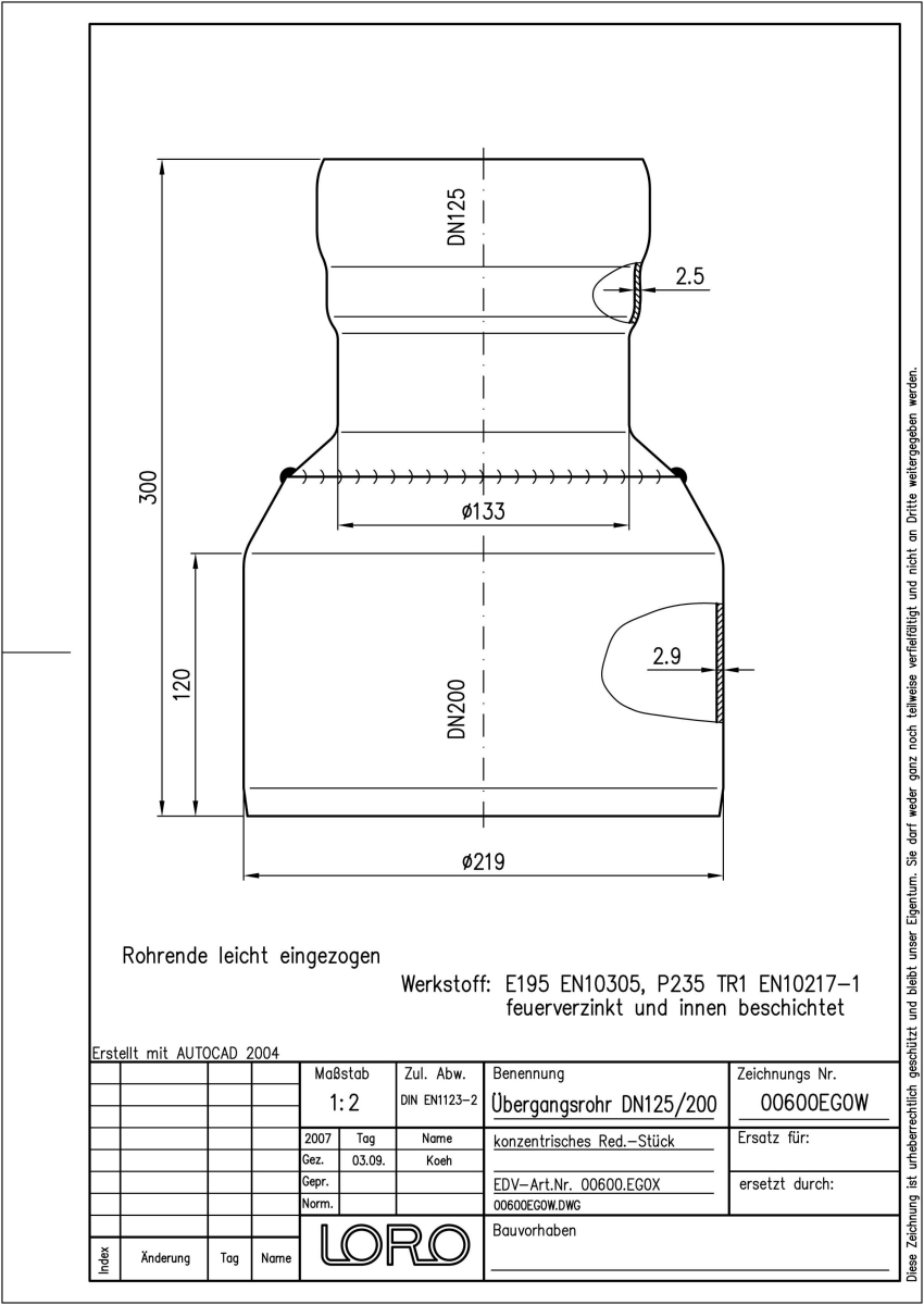 LORO-X Übergangsrohr, aus Stahl, feuerverzinkt, konzentrisch, nach DIN EN 1123 mit erhöhtem Qualitätsstandard gemäß RAL-Gütezeichen GZ 694, mit 2-Kammern-Steckmuffenverbindung, Baustoffklasse A1, formstabil, bruchfest, rückstausicher, langlebige Innenbeschichtung gemäß DIN EN ISO 2178 auf Basis einer 2K-Epoxid-Kombination, Farbton: Rotbraun, DN 125/200