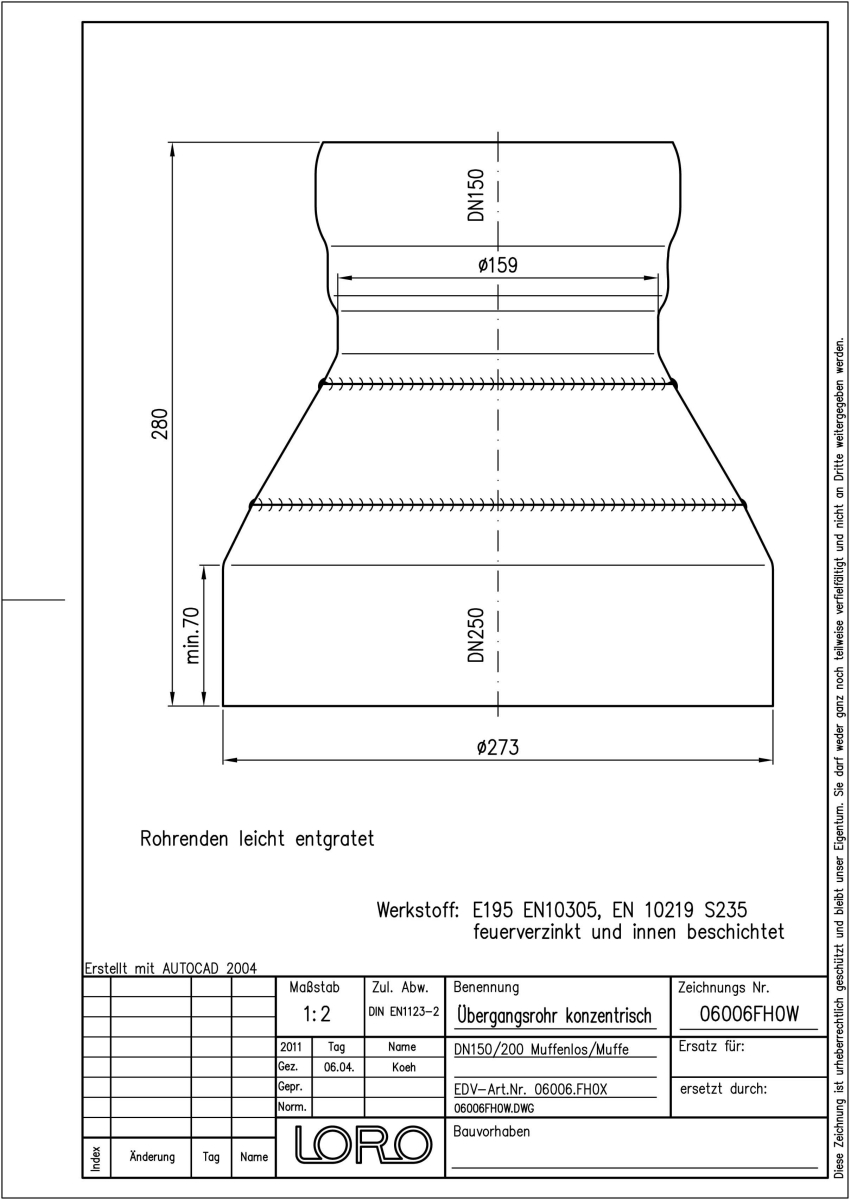 LORO-XML Übergangsrohr, aus Stahl, feuerverzinkt, von LORO-X Rohr mit Muffe an LORO-XML Rohr muffenlos konzentrisch, nach DIN EN 1123 mit erhöhtem Qualitätsstandard gemäß RAL-Gütezeichen GZ-694, Baustoffklasse A1, formstabil, bruchfest, rückstausicher, langlebige Innenbeschichtung gemäß DIN EN ISO 2178 auf Basis einer 2K-Epoxid-Kombination, Farbton: Rotbraun, Zulassung Nr. Z-42.1-346 vom DIBt, DN 150/200