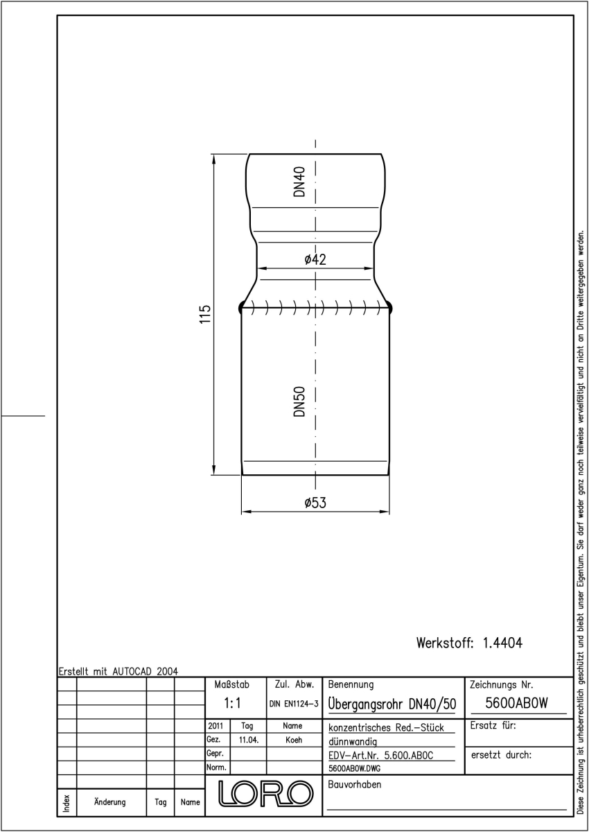 LORO-XCL Übergangsrohr konzentrisch, konzentrisch, aus Edelstahl, Werkstoff Nr. 1.4404, gebeizt und passiviert, nach DIN EN 1124 mit erhöhtem Qualitätsstandard gemäß RAL-Gütezeichen GZ-694, mit 2-Kammern-Steckmuffenverbindung, Baustoffklasse A1, formstabil, bruchfest, rückstausicher, DN 40/50