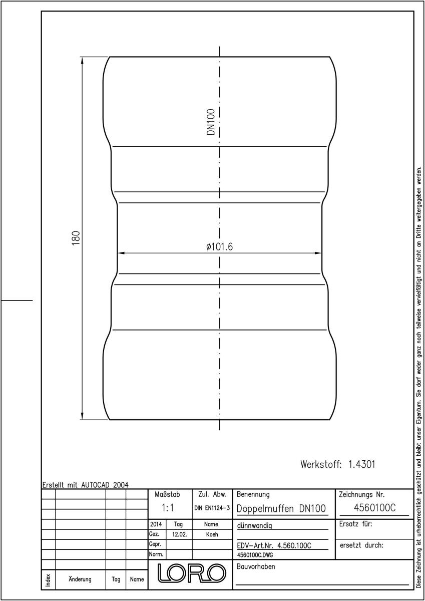 LORO-XCL Doppelmuffe, aus Edelstahl, Werkstoff Nr. 1.4301, gebeizt nach DIN EN 1124, mit erhöhtem Qualitätsstandard gemäß RAL-Gütezeichen GZ-694, mit 2-Kammern-Steckmuffenverbindung, , Baustoffklasse A1, formstabil, bruchfest, rückstausicher, DN 100