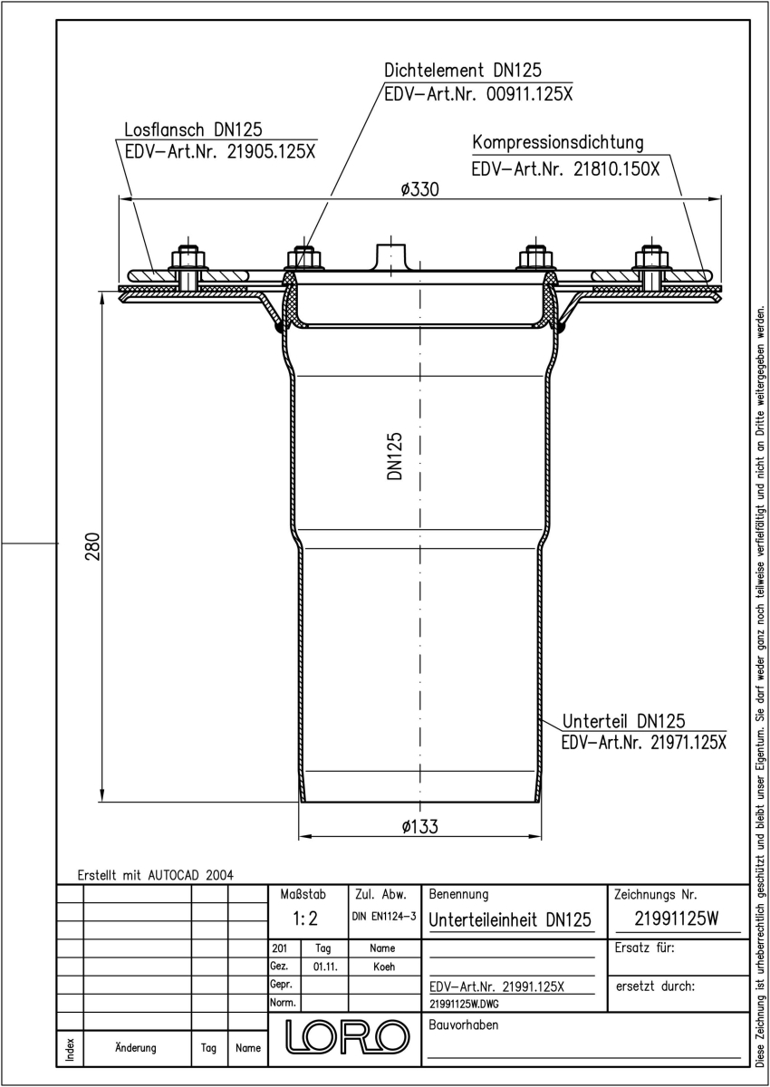 LORO-DRAINJET/LET Flachdach-Schnellablauf Unterteileinheit für Druckströmung mit planmäßiger Vollfüllung und Freispiegelströmung, nach DIN EN 1253 mit erhöhtem Qualitätsstandard gemäß RAL-Gütezeichen, mit Klemmflansch, als Los- und Festflanschkonstruktion, aus Edelstahl, Auslauf senkrecht, ohne Wärmedämmung, einteilig, bestehend aus Unterteil, Losflansch, einschließlich Kompressionsdichtungen, Dichtelement, DN 125