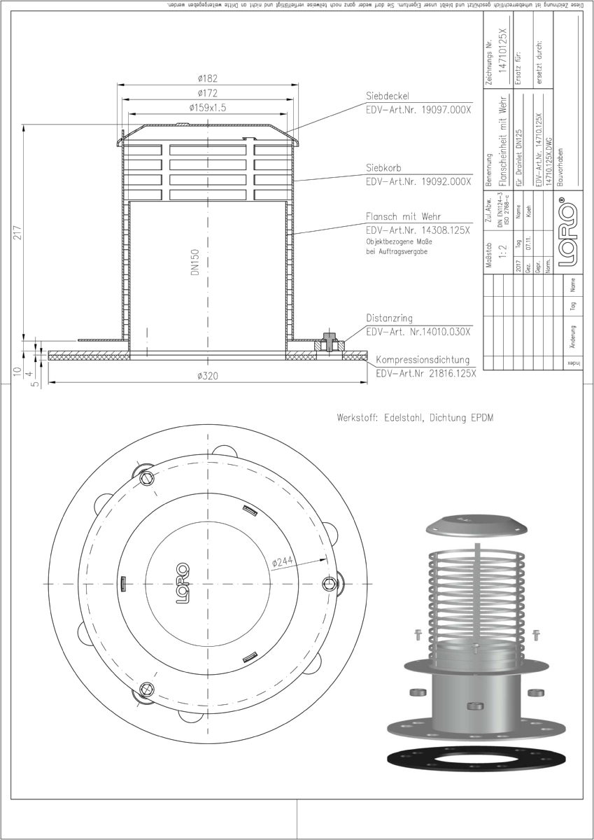 DN 125, f.Notentw/Wehr, Sieb. 210mm, VA