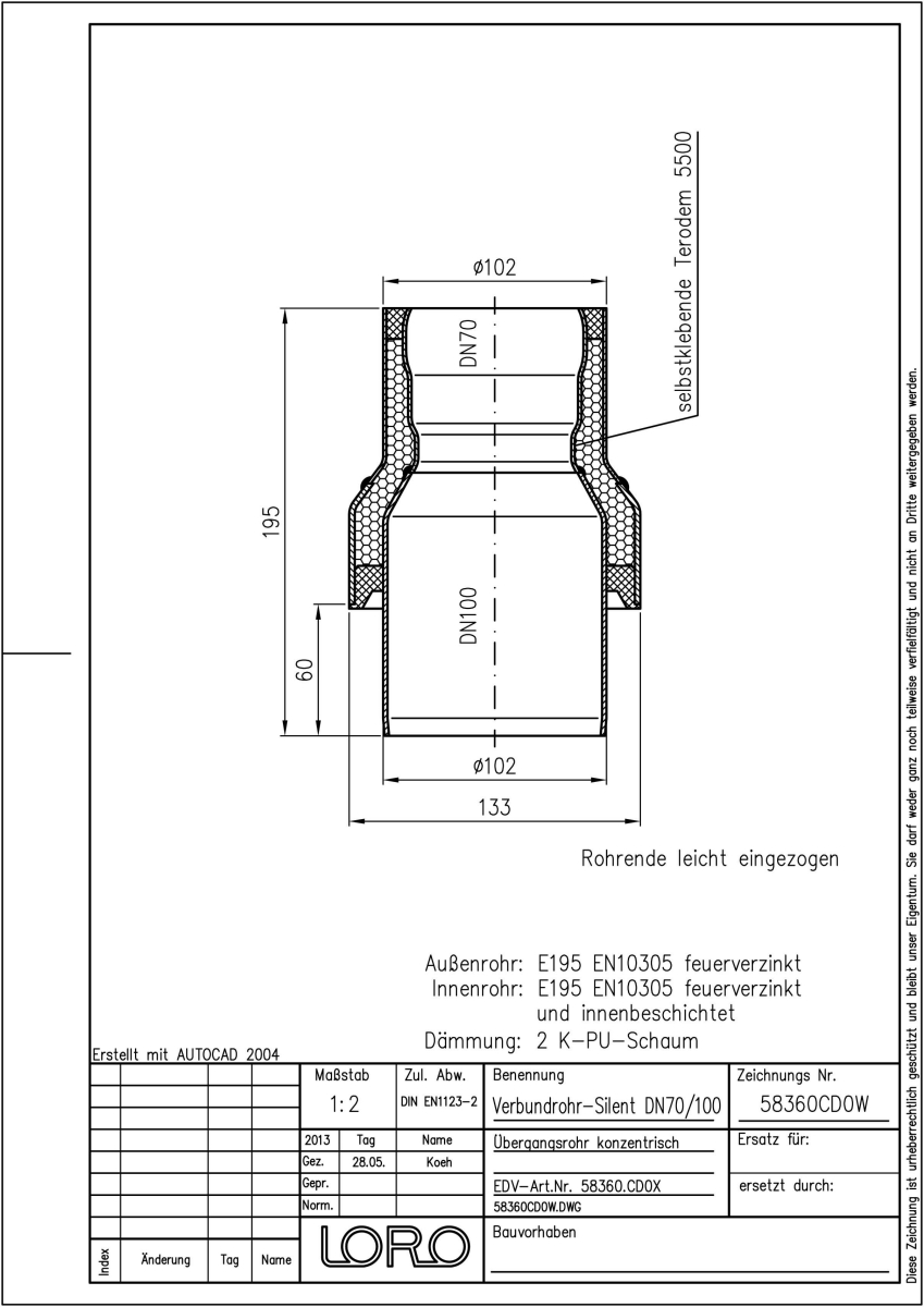 LORO-X Verbundrohr-Übergangsrohr SILENT, für erhöhte Schalldämmung, bestehend aus: Innenrohr (LORO-X Rohr, aus Stahl, feuerverzinkt, nach DIN EN 1123, mit erhöhtem Qualitätsstandard gemäß RAL-Gütezeichen GZ-694, mit 2-Kammern-Steckmuffenverbindung, Baustoffklasse A1, formstabil, bruchfest, rückstausicher, langlebige Innenbeschichtung gemäß DIN EN ISO 2178 auf Basis einer 2K-Epoxid-Kombination, Farbton: Rotbraun), Schallschutzmatte (am Innenrohr angebracht), Dämmschicht (PU-Hartschaum B2, FCKW-frei) und Außenrohr (LORO-X Rohr, feuerverzinkt), konzentr. Red.-Stück., DN 70/100
