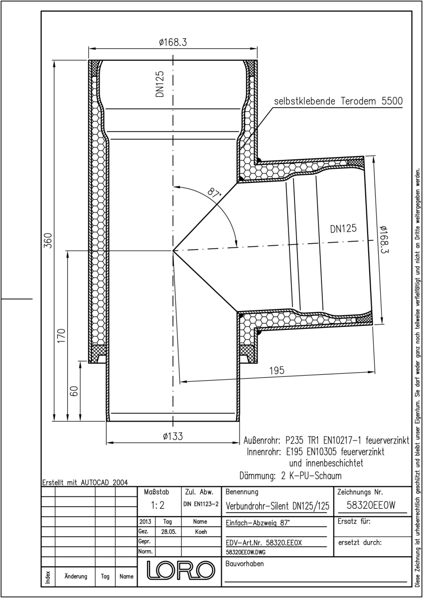 LORO-X Verbundrohr-Abzweig, Ausführung SILENT, für erhöhte Schalldämmung, bestehend aus: Innenrohr (LORO-X Rohr, aus Stahl, feuerverzinkt, nach DIN EN 1123, mit erhöhtem Qualitätsstandard gemäß RAL-Gütezeichen GZ-694, mit 2-Kammern-Steckmuffenverbindung, Baustoffklasse A1, formstabil, bruchfest, rückstausicher, langlebige Innenbeschichtung gemäß DIN EN ISO 2178 auf Basis einer 2K-Epoxid-Kombination, Farbton: Rotbraun), Schallschutzmatte (am Innenrohr angebracht), Dämmschicht (PU-Hartschaum B2, FCKW-frei) und Außenrohr (LORO-X Rohr, feuerverzinkt) 87 Grad, DN 125