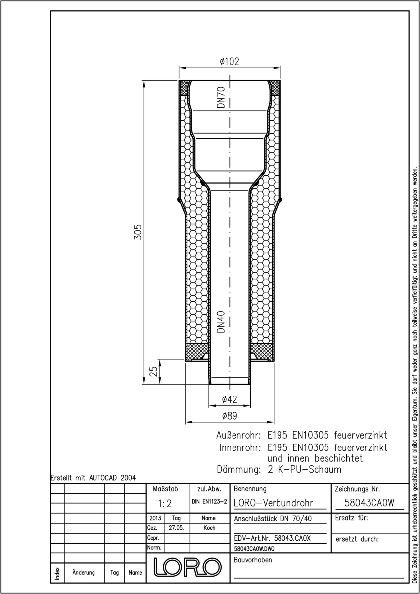 LORO-DRAINJET Verbundrohr-Anschlussstück, bestehend aus Innenrohr (LORO-X Rohr, aus Stahl, feuerverzinkt, nach DIN EN 1123, mit erhöhtem Qualitätsstandard gemäß RAL-Gütezeichen GZ-694, mit 2-Kammern-Steckmuffenverbindung, Baustoffklasse A1, formstabil, bruchfest, rückstausicher, langlebige Innenbeschichtung gemäß DIN EN ISO 2178 auf Basis einer 2K-Epoxid-Kombination, Farbton: Rotbraun), Dämmschicht (PU-Hartschaum B2, FCKW-frei) und Außenrohr (LORO-X Rohr, feuerverzinkt), DN 70/40