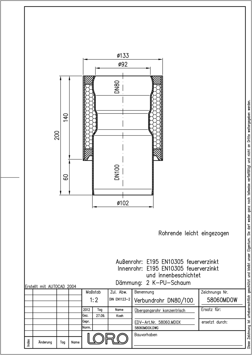 LORO-X Verbundrohr Übergangsrohr (konzentr. Red.-Stück) bestehend aus Innenrohr (LORO-X Rohr, aus Stahl, feuerverzinkt, nach DIN EN 1123, mit erhöhtem Qualitätsstandard gemäß RAL-Gütezeichen GZ-694, mit 2-Kammern-Steckmuffenverbindung, Baustoffklasse A1, formstabil, bruchfest, rückstausicher, langlebige Innenbeschichtung gemäß DIN EN ISO 2178 auf Basis einer 2K-Epoxid-Kombination, Farbton: Rotbraun), Dämmschicht (PU-Hartschaum B2, FCKW-frei) und Außenrohr (LORO-X Rohr, feuerverzinkt), DN 80/100