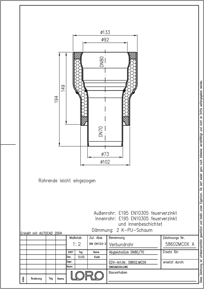 LORO-DRAINJET Verbundrohr-Abgleichstück, bestehend aus: Innenrohr (LORO-X Rohr, aus Stahl, feuerverzinkt, nach DIN EN 1123, mit erhöhtem Qualitätsstandard gemäß RAL-Gütezeichen GZ-694, mit 2-Kammern-Steckmuffenverbindung, Baustoffklasse A1, formstabil, bruchfest, rückstausicher, langlebige Innenbeschichtung gemäß DIN EN ISO 2178 auf Basis einer 2K-Epoxid-Kombination, Farbton: Rotbraun), Dämmschicht (PU-Hartschaum B2, FCKW-frei) und Außenrohr (LORO-X Rohr, feuerverzinkt), DN 80/70