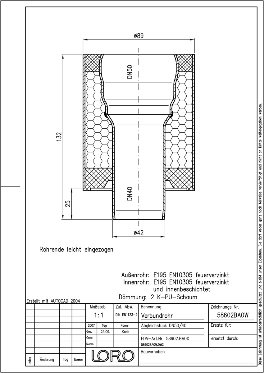 LORO-DRAINJET Verbundrohr-Abgleichstück, bestehend aus: Innenrohr (LORO-X Rohr, aus Stahl, feuerverzinkt, nach DIN EN 1123, mit erhöhtem Qualitätsstandard gemäß RAL-Gütezeichen GZ-694, mit 2-Kammern-Steckmuffenverbindung, Baustoffklasse A1, formstabil, bruchfest, rückstausicher, langlebige Innenbeschichtung gemäß DIN EN ISO 2178 auf Basis einer 2K-Epoxid-Kombination, Farbton: Rotbraun), Dämmschicht (PU-Hartschaum B2, FCKW-frei) und Außenrohr (LORO-X Rohr, feuerverzinkt), DN 50/40