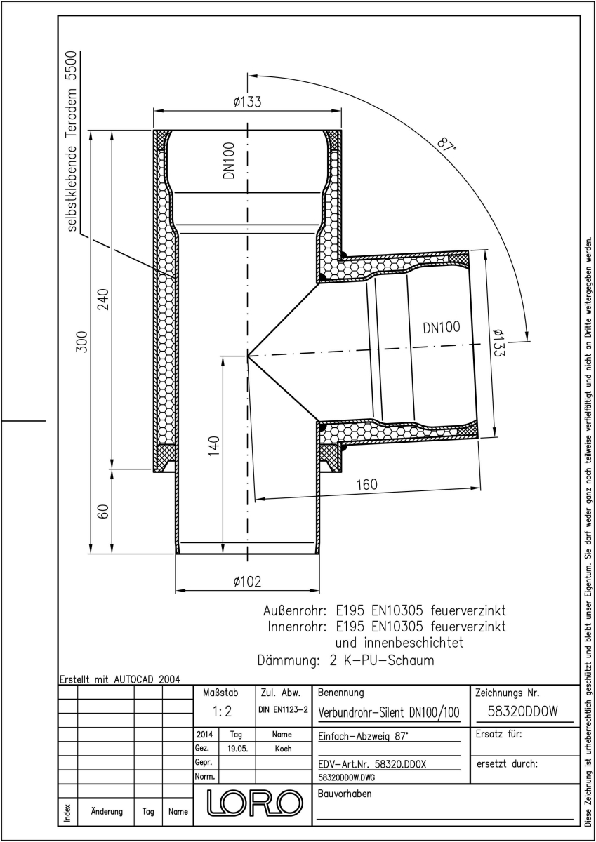 LORO-X Verbundrohr-Abzweig, Ausführung SILENT, für erhöhte Schalldämmung, bestehend aus: Innenrohr (LORO-X Rohr, aus Stahl, feuerverzinkt, nach DIN EN 1123, mit erhöhtem Qualitätsstandard gemäß RAL-Gütezeichen GZ-694, mit 2-Kammern-Steckmuffenverbindung, Baustoffklasse A1, formstabil, bruchfest, rückstausicher, langlebige Innenbeschichtung gemäß DIN EN ISO 2178 auf Basis einer 2K-Epoxid-Kombination, Farbton: Rotbraun), Schallschutzmatte (am Innenrohr angebracht), Dämmschicht (PU-Hartschaum B2, FCKW-frei) und Außenrohr (LORO-X Rohr, feuerverzinkt) 87 Grad, DN 100