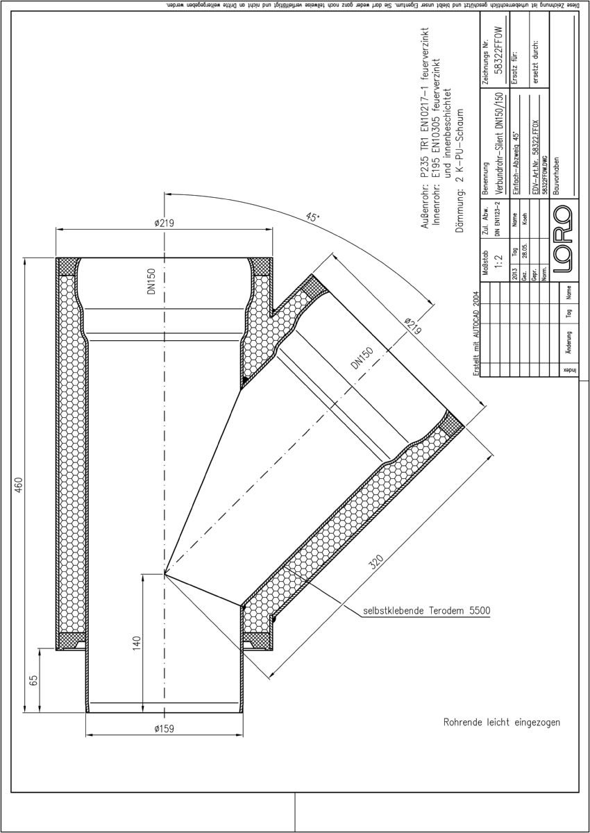 LORO-X Verbundrohr-Abzweig, Ausführung SILENT, für erhöhte Schalldämmung, bestehend aus: Innenrohr (LORO-X Rohr, aus Stahl, feuerverzinkt, nach DIN EN 1123, mit erhöhtem Qualitätsstandard gemäß RAL-Gütezeichen GZ-694, mit 2-Kammern-Steckmuffenverbindung, Baustoffklasse A1, formstabil, bruchfest, rückstausicher, langlebige Innenbeschichtung gemäß DIN EN ISO 2178 auf Basis einer 2K-Epoxid-Kombination, Farbton: Rotbraun), Schallschutzmatte (am Innenrohr angebracht), Dämmschicht (PU-Hartschaum B2, FCKW-frei) und Außenrohr (LORO-X Rohr, feuerverzinkt) 45 Grad, DN 150